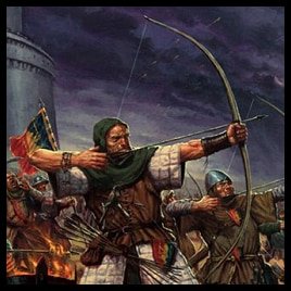 Ma di lì a poco dal fronte opposto giunse un grande squillo di corni e trombe, e fu come se un fiume d’acciaio e cotte lucenti si riversasse nel campo davanti a noi, e i corni soffiarono ancora mentre i nemici si dispiegavano sulla sinistra della nostra linea. Il bestiame al pascolo, che fino a un attimo prima brucava tranquillamente, spaventato dal rumore improvviso, prese a correre di qua e di là. Il vecchio toro, con la testa abbassata e le zampe ostinatamente piantate nel terreno, muggiva minaccioso; mentre le oche intorno al ruscello caracollavano via tra strida e starnazzi. Tutto ciò ci sembrò talmente incongruo, mentre dallo sgargiante schieramento nemico risuonava una minaccia di morte imminente, che la maggior parte di noi scoppiò a ridere di gusto, e Will Green abbassò la testa per imitare il toro grugnendo come lui, cosa che ci fece ridere ancora di più. Si girò verso di me mentre incoccava la freccia e disse: «Vorrei che fossero solo cinquanta passi più vicini, ma non si muovono. Oh, Jack Straw, tiriamo?».