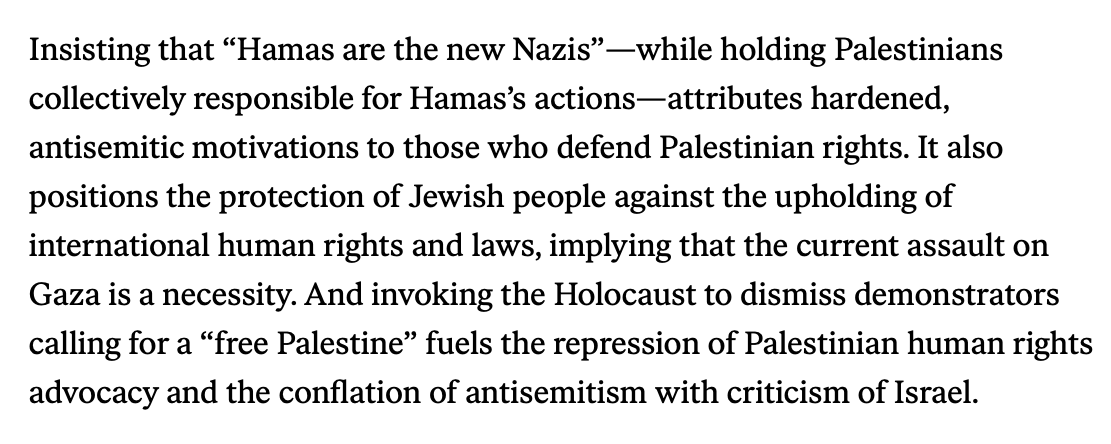 Insistere sul fatto che “Hamas sono i nuovi nazisti” – mentre si ritengono i palestinesi collettivamente responsabili delle azioni di Hamas – significa attribuire motivazioni spietate e antisemite a coloro che difendono i diritti dei palestinesi. Ciò, inoltre, contrappone la protezione del popolo ebraico contro il rispetto dei diritti umani e delle leggi internazionali, il che implica giustificare come necessario l’attuale attacco a Gaza. E invocare l’Olocausto per respingere i manifestanti che chiedono una “Palestina libera” alimenta la repressione della difesa dei diritti umani palestinesi e la confusione dell’antisemitismo con la critica a Israele».