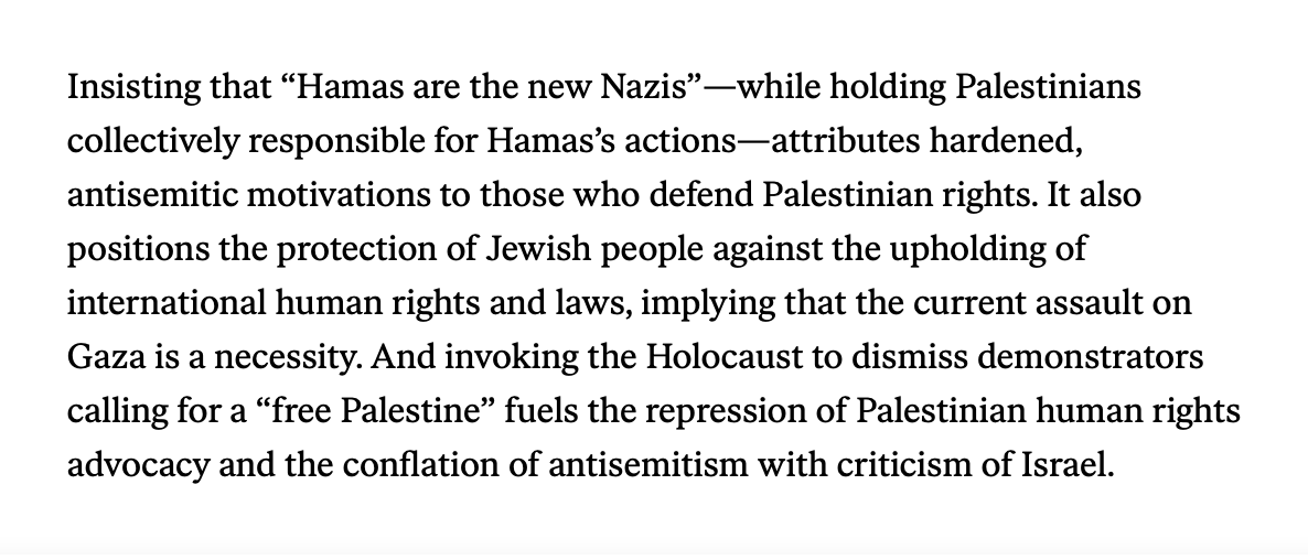 Insistere sul fatto che “Hamas sono i nuovi nazisti” – mentre si ritengono i palestinesi collettivamente responsabili delle azioni di Hamas – significa attribuire motivazioni spietate e antisemite a coloro che difendono i diritti dei palestinesi. Ciò, inoltre, contrappone la protezione del popolo ebraico contro il rispetto dei diritti umani e delle leggi internazionali, il che implica giustificare come necessario l’attuale attacco a Gaza. E invocare l’Olocausto per respingere i manifestanti che chiedono una “Palestina libera” alimenta la repressione della difesa dei diritti umani palestinesi e la confusione dell’antisemitismo con la critica a Israele».
