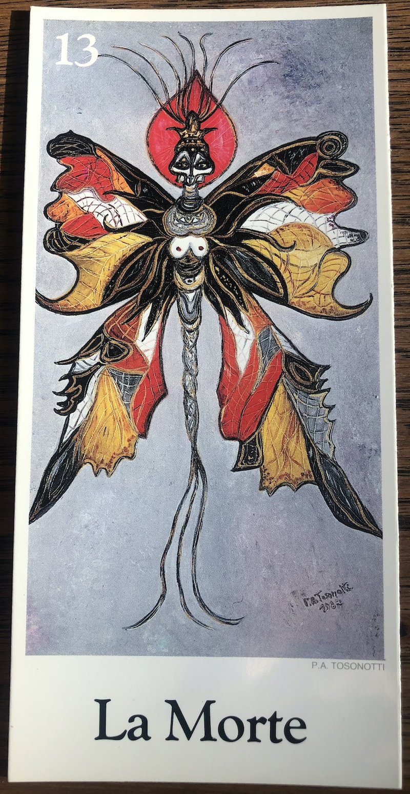 Chi già conosce la trama di Mensaleri, capirà il nostro stupore di fronte a una lama dei tarocchi che ci ha mostrato una lettrice. È l’arcano numero 13, la Morte, e compare in un mazzo reinterpretato da ventidue pittori e pittrici, stampato in duecento esemplari numerati da Il Meneghello di Milano. La figura in questione è opera di Pina Andronico Tosonotti.