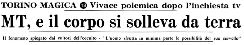 Il diciottesimo articolo è, più che un pezzo giornalistico, una velina pubblicitaria camuffata da servizio divulgativo (e forse per questo non è firmato): annuncia una conferenza sulla Meditazione Trascendentale che si terrà quella stessa sera a Torino, ma lo fa fingendo di informare in modo spassionato. Presentata come una tecnica di rilassamento accessibile a tutti, la pratica viene proposta come un percorso di risveglio interiore che può far sollevare da terra chi la pratica.