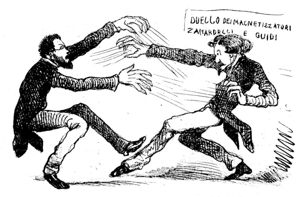 Per sottrarsi al dualismo verità/illusione è utile riportare alla luce vicende in cui la linea tra “buoni” e “cattivi” si fa incerta. Nel 1856 Torino ne offrì una memorabile: il duello pubblico tra Francesco Guidi, magnetizzatore convinto della genuinità dei propri poteri, e Antonio Zanardelli, illusionista sostenuto dalla scienza ufficiale. A eseguire le dimostrazioni furono le giovani Luisa ed Elisa. Alla prova degli spilloni – che consisteva nel trafiggere le braccia delle assistenti – Guidi ipnotizzò Luisa e lei sopportò le punture mostrando poco fastidio. Zanardelli, convinto che l’ipnosi non avesse effetti anestetizzanti, si rifiutò di pungere la figlia e scelse invece un ragazzino di strada.