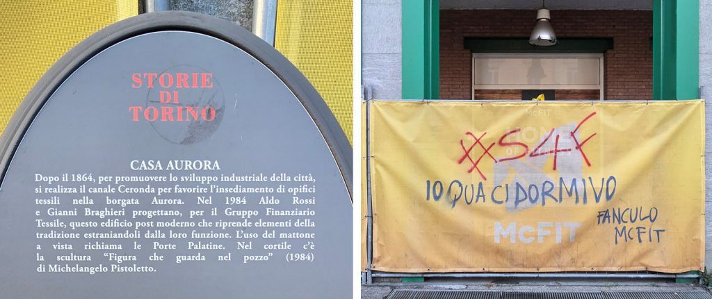 Un cartello turistico su corso Emilia segnala la presenza della scultura di Pistoletto – ma la guardia all’ingresso dice di non averla mai vista. Solo cercando altrove emerge che una fondazione bancaria l’ha trasferita al Museo d’Arte Contemporanea di Rivoli, sottraendola al quartiere. Nel frattempo, su un telo che impedisce l’accesso ai portici compare una scritta: «Io qua ci dormivo. Fanculo».