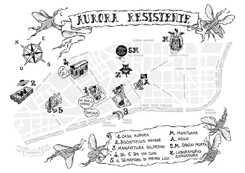“Aurora resistente” nella mappa di Spokkio tratta dal libretto Aurora nonumentale. Memorie resistenti edito da Spazio Muffa (uscita prevista per il 25 aprile 2026).